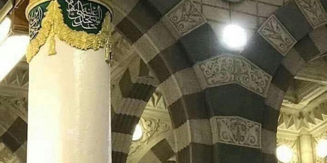 العامود او الاسطوانة المزينّة بالتاج الاخضر فى أعلاه وعليه كتابة : حد مسجد رسول الله عليه الصلاة والسلام .. بزخرفة ذهبية على الاسطوانات تدل على حدود المسجد النبوى الشريف في زمن النبي عليه