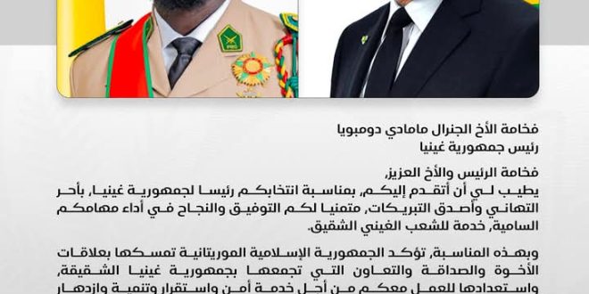 فخامة رئيس الجمهورية السيد محمد ولد الشيخ الغزواني يهنئ الجنرال مامادي دومبويا بمناسبة انتخابه رئيسا لجمهورية غينيا . المصدر صفحة رآسة الجمهورية